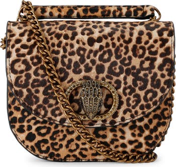 A signature jewel-encrusted eagle head adorns the flap of a genuine calf-hair saddle bag fitted with a single top handle and pull-through chain strap for versatile wear.