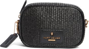 High-polish logo hardware and a house-signature eagle head gleam at the front of this compact camera bag made from artfully woven faux raffia.