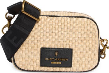 Leather piping and a logo-embellished patch elevate a woven crossbody bag that delivers vacay-ready style.