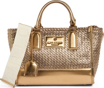 Glam up your look with this metallic handbag featuring woven panels, rolled top handles and a removable, adjustable strap.