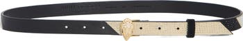 Brand-signature eagle-head hardware lends heritage appeal to the buckle on this slim belt done in bold colorblocking with tonal rhinestone accents and grained leather paneling.