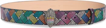 A signature crystal-encrusted eagle head adds a touch of branded charm to this colorful monogram belt.
