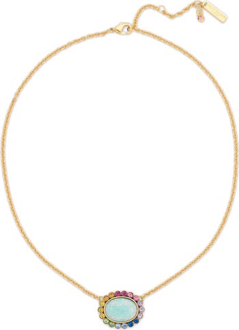 A rainbow of sparkling crystals encircles the shimmering pendant of this endlessly elegant goldtone chain necklace.
