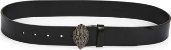 A buckle featuring the brand’s signature crystal-encrusted eagle head secures this smooth leather belt.