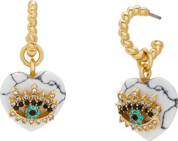 Evil eye charms illuminated with multicolored crystals adorn the heart-shaped turquoise drops on these twisted huggie earrings, creating a dreamy, mystical look.