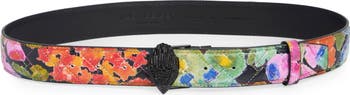 The brand's signature eagle-head icon acts as the jeweled buckle that blings up this leather belt covered in painterly blooms.