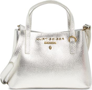 A logo plaque and eagle-head hardware deliver brand-signature charm to a structured metallic tote bag crafted from grained leather.