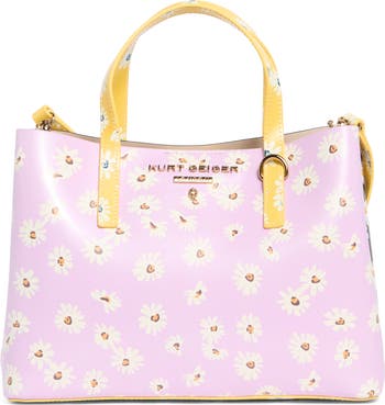 Daisies set against different backgrounds create a colorblocked effect on this compact tote fitted with a triple‑compartment interior and shaped from smooth leather.