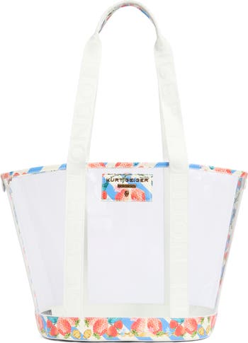 A clear vinyl design makes it easy to spot your beach essentials in this tote finished with a sea‑inspired print and a coordinating zip pouch.