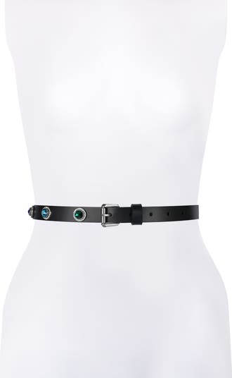Bejeweled studs line a smooth leather belt and bring a bedazzling lift to any look you pair with it.