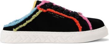 Neon faux-shearling trim lends eclectic color to this modern mule-sneaker set atop a chunky platform sole.