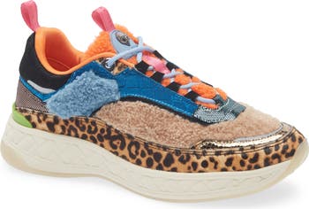 Genuine calf hair, fluffy faux shearling, soft velvet and leather amplify the bold attitude of this paneled sneaker crowned by a signature eagle's-head charm.