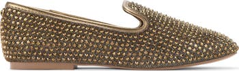 Allover crystals sparkle and shine on this glamorous version of an essential square-toe loafer.