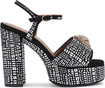 A signature crystal-encrusted eagle head shines atop a statement-making sandal lifted by a chunky platform and block heel.