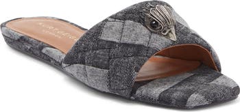 A signature crystal-encrusted eagle head tops the patchwork denim strap of a casual-chic slide sandal.