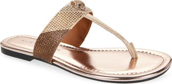 A signature crystal-encrusted eagle head tops this summery T-strap sandal designed with a metallic sheen and slightly elevated heel.