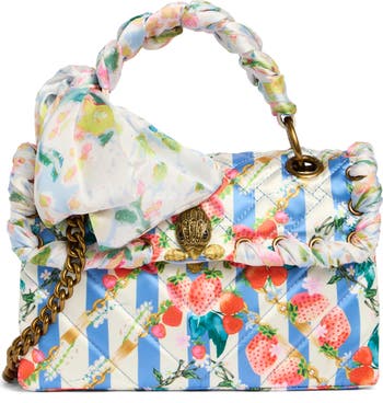 A vibrant strawberry print adds warm-weather charm to this structured bag shaped in a compact profile and fitted with an optional crossbody strap for hands-free wear.
