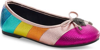 A delicate bow and signature crystal-encrusted eagle head enrich the vamp of a colorful leather ballet flat that your kiddo is sure to adore.