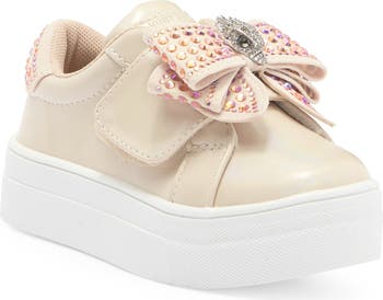 A signature eagle head and crystal-encrusted bow lend pint-sized charm to a play-ready leather sneaker grounded by a durable cupsole.
