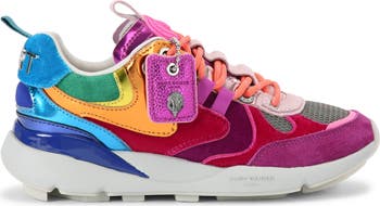 Sporty style takes a glam turn with this chunky-sole sneaker covered in colorful overlays.