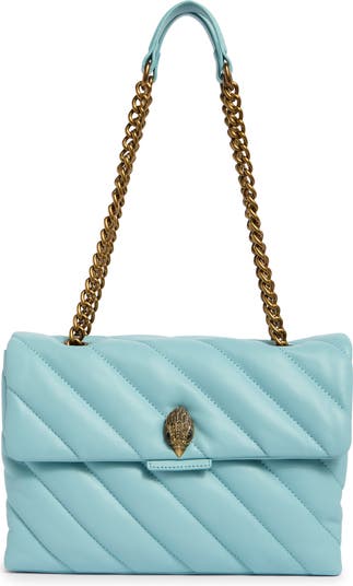 Diagonal quilted stripes distinguish a structured shoudler bag rendered in supple leather and finished with a signature crystal-embellished eagle head. A pull-through chain strap that can be worn doubled or extended adds styling versatility.