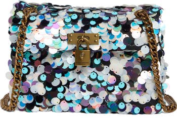 Signature padlock hardware shines on the high-shine sequins exterior of a scaled-down crossbody bag outfitted with a pull-through chain strap for versatile wear.