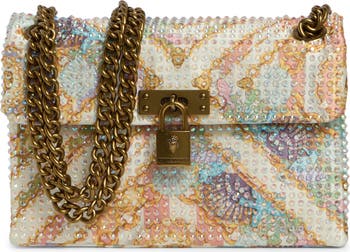 A bold print, shimmery rhinestones and signature eagle-head hardware define a shoulder bag from the brand who always makes a unique statement.
