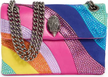 Mixed textures and wavy stripes highlight the vibrant exterior of a fierce leather bag suspended from a pull-through chain strap perfect for shoulder or crossbody wear.
