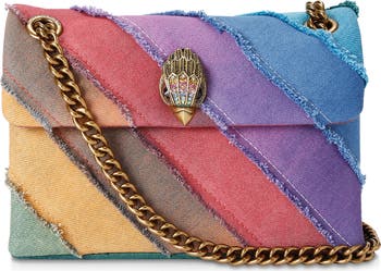 Denim strips mimic the style's signature quilted look on an eagle-embellished crossbody bag equipped with plenty of pockets and a pull-through chain strap.