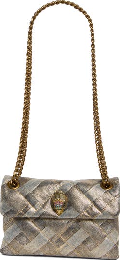 A metallic quilted shoulder bag with brassy hardware and the brand’s signature crystal-encrusted eagle head offers ample space for your daily essentials.