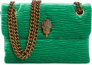 A pull-through chain strap and eagle-head hardware bring heritage appeal to an ultraslim crossbody bag shaped from soft velvet with a rich texture.
