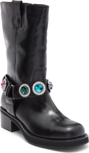 Rainbow crystals glam up this soft leather boot framed by an easy side-zip closure and stacked block heel.