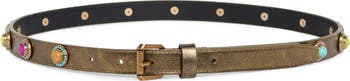 Sparkling crystals and colorful faux stones brighten this sleek belt that instantly glams up everyday looks.