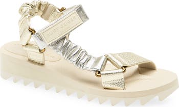 Ruched, metallic straps add a bit of flair to an outfit-making sandal set on a razor-lug sole.