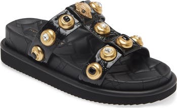 Sparkly embellishments add signature flourish to a sporty slide sandal featuring pillowy quilting and a comfy contoured footbed.