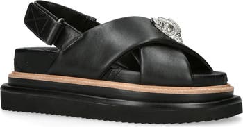 Crystal-encrusted eagle hardware adds signature glamour to a sandal topped with wide, crisscrossing straps.
