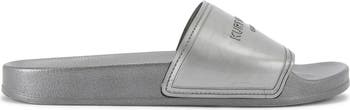 Monochromatic logo branding details the upper of a casual slide sandal grounded by a contoured footbed for a customized fit.