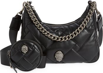 Signature quilting and a crystal-embellished eagle head lend trendsetting appeal to a leather crossbody bag furnished with a coordinating zip pouch.
