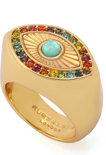 Rainbow-hued crystals bring subtle brand-signature charm to a polished cocktail ring topped with a striking evil eye.