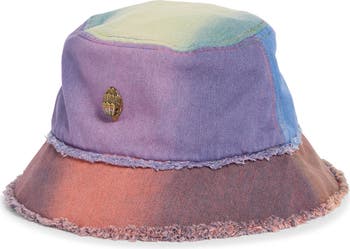 Frayed denim and gradient coloring distinguish a trend-savvy bucket hat fashioned with a crystal-encrusted eagle head for signature appeal.