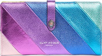 A jewel-encrusted eagle's head shines on the quilted exterior of a zip leather wallet with a well-organized interior for your cards and cash.