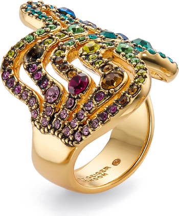 Dynamic waves glittering with rainbow-hued crystals add a statement-making splash to ensembles paired with this captivating cocktail ring.