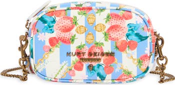 A baroque pattern interspersed with strawberries makes a colorful statement on this compact camera bag made from sleek coated leather.