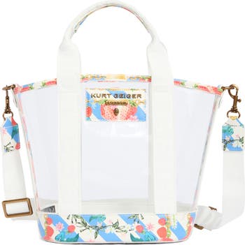 A clear vinyl design makes it easy to spot your beach essentials in this tote finished with a sea‑inspired print and a coordinating zip pouch.