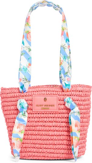 Elevate your sunny‑day styles with this spacious tote made from woven raffia and outfitted with knotted scarf straps.