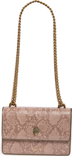 A sophisticated crossbody bag fashioned in snakeskin-embossed leather and styled with a chain-link strap features the brand's signature eagle head on the front flap.