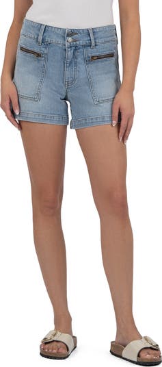 Front-zip pockets and a two-button waist switch up the classic style of mid-rise, low-stretch denim shorts in a casual medium wash.