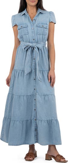Chest pockets and a belted waist enhance the utility-inspired style of a cap-sleeve shirtdress that's perfect for your weekend plans.