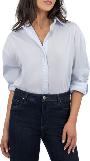 This polished closet-staple shirt is crafted from crisp stretch poplin and punctuated with a tuckable shirttail hem.