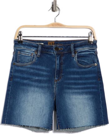A faded wash and raw hems bring casual appeal to these comfortable boyfriend shorts cut from soft cotton-blend denim.